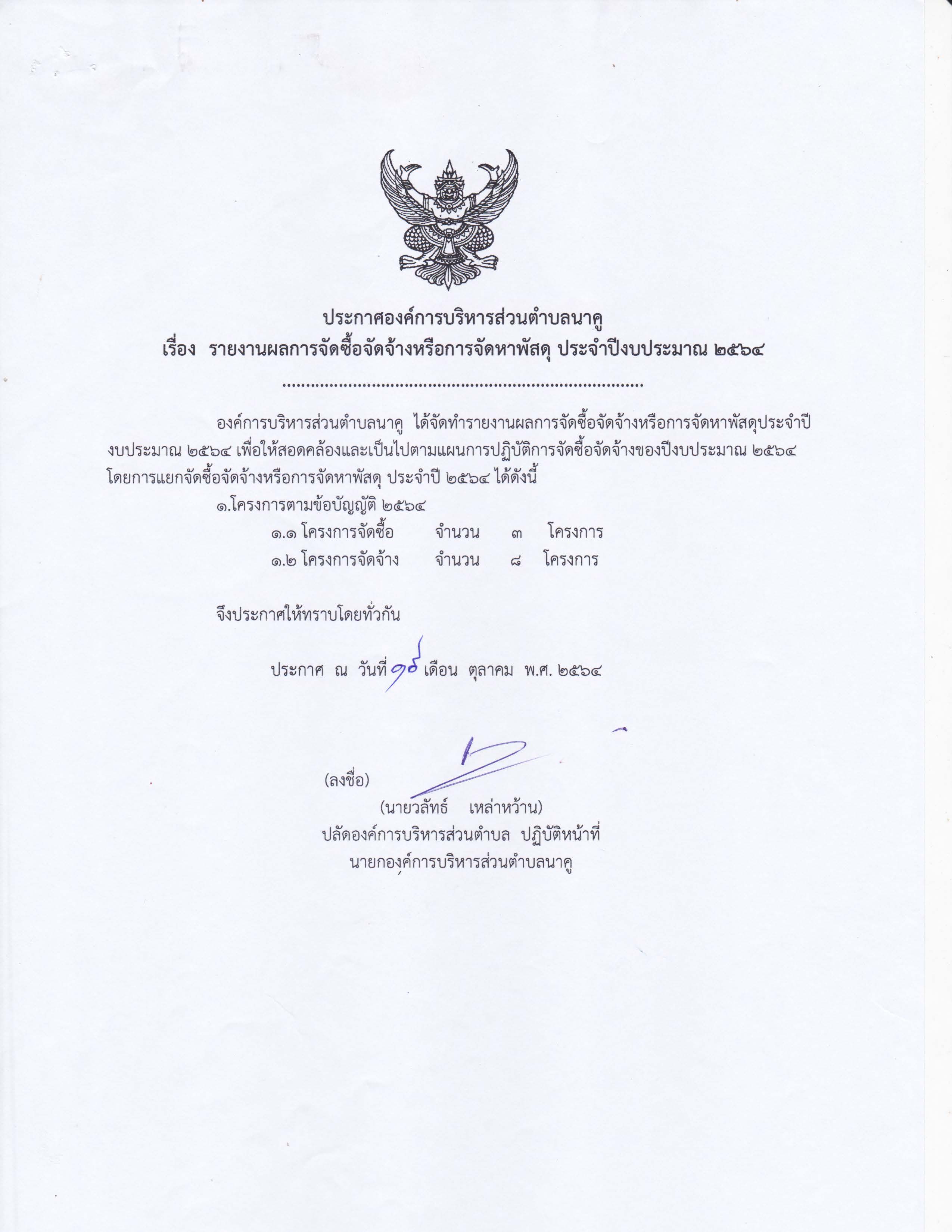 ประกาศองค์การบริหารส่วนตำบลนาคู เรื่อง รายงานผลการดำเนินการจัดซื้อหรือการจัดหาพัสดุ ประจำปีงบประมาณ